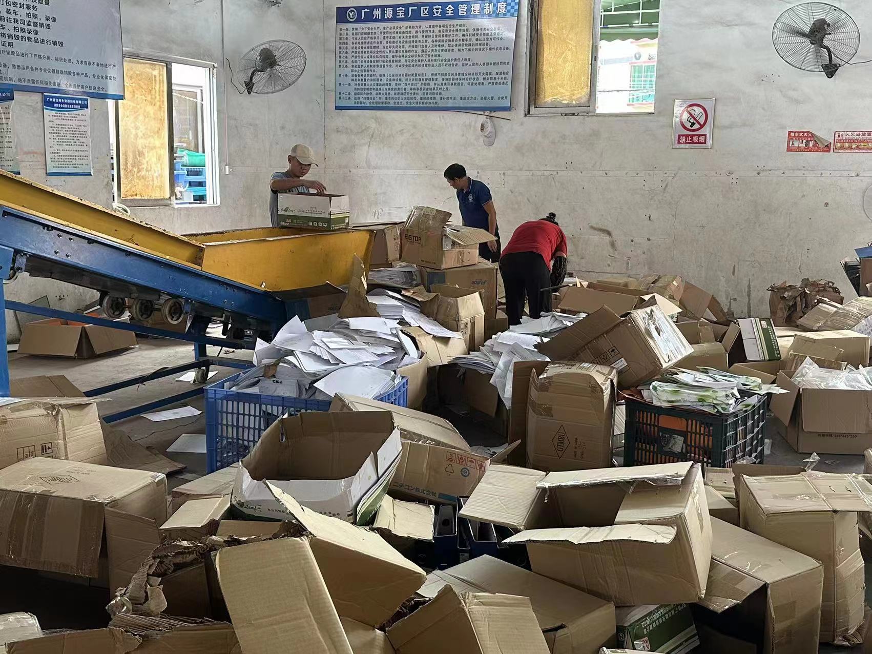 近期我们协助一家公司销毁文件资料档案,销毁资料档案 共计110箱。客户所在公司是在深圳的,通过线上找到我们源宝销毁中心,说明公司需求销毁文件后,我们通过线上沟通确定了销毁流程方案与时间。销毁当天,我们派工作人员开车上门提供免费的打包服务,客户跟车来到我们源宝深圳文件档案销毁厂区,到达之后工作人员立马进行卸货分拣销毁,整个过程都有监控录像,共计耗时1小时。文件档案销毁结束后,我们开具了相关的销毁证明和销毁报告给到客户。